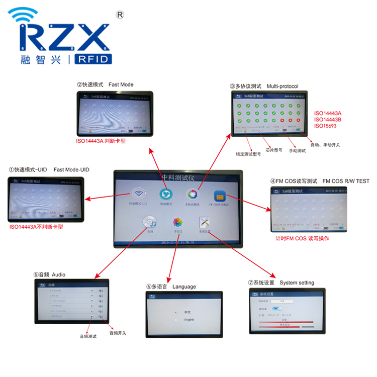 B、LED菜單顯示屏,支持多種測試模式:如UID快速模式;多協(xié)議測試;FM COS讀寫測試;音頻;多語言;系統(tǒng)設(shè)置。